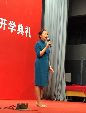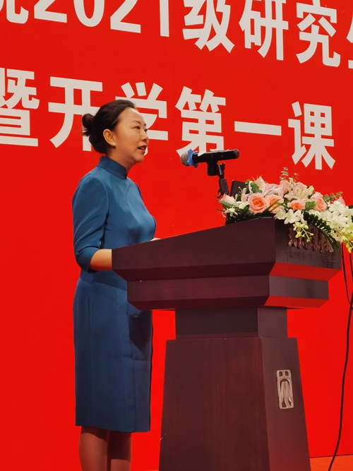 周志軍首先代表學校全體師生,向2021級研究生新同學的到來表示最熱烈的歡迎。她用了一組數據開場,她說:在座的460名同學,其中80%是女生,25%本科就在北服就讀。同學們分別來自全國214所高校,從五湖四海走到一起。希望大家在研究生階段,比本科生階段有更寬的視野和更高的格局,認真思考在未來兩年半的學術研究和美好生活的歲月,如何能夠成為更好的自己。