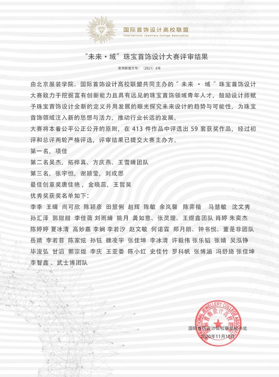 本次活動同期舉行了“未來·域”首飾設計全球競賽及頒獎禮。“未來·域”珠寶首飾設計大賽由國際首飾設計高校聯盟主辦的年度重點賽事。本屆大賽緊扣“未來”主題,評審委員會根據概念的先鋒性、視覺的創新性、工藝的完成度圍繞著未來價值、社會價值、市場應用等進行討論評選,最終評選出9位設計師的作品獲得“未來·域”設計大獎。中國輕工業聯合會副會長劉江毅,北京服裝學院校黨委書記周志軍,國際首飾設計高校聯盟主席、北京服裝學院院長賈榮林為獲獎者代表頒發證書和獎杯。
