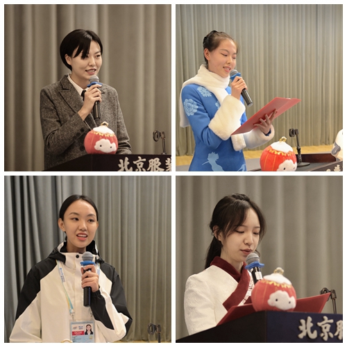 我校冬奧志愿者帶隊教師代表曲悅老師、冬奧演職人員代表荊典、禮儀志愿者代表亓涓酈、通用志愿者代表李琳同學分別進行發言交流,李琳同學帶領賽會志愿者一齊莊嚴宣誓志愿服務北京2022年冬奧會和冬殘奧會,以強烈的責任感、使命感和榮譽感,以及熱情周到的志愿服務,詮釋“奉獻、友愛、互助、進步”的志愿精神,出色完成好北京2022年冬奧會冬殘奧會的志愿服務任務,為奧運盛會的成功舉辦,貢獻北服力量!