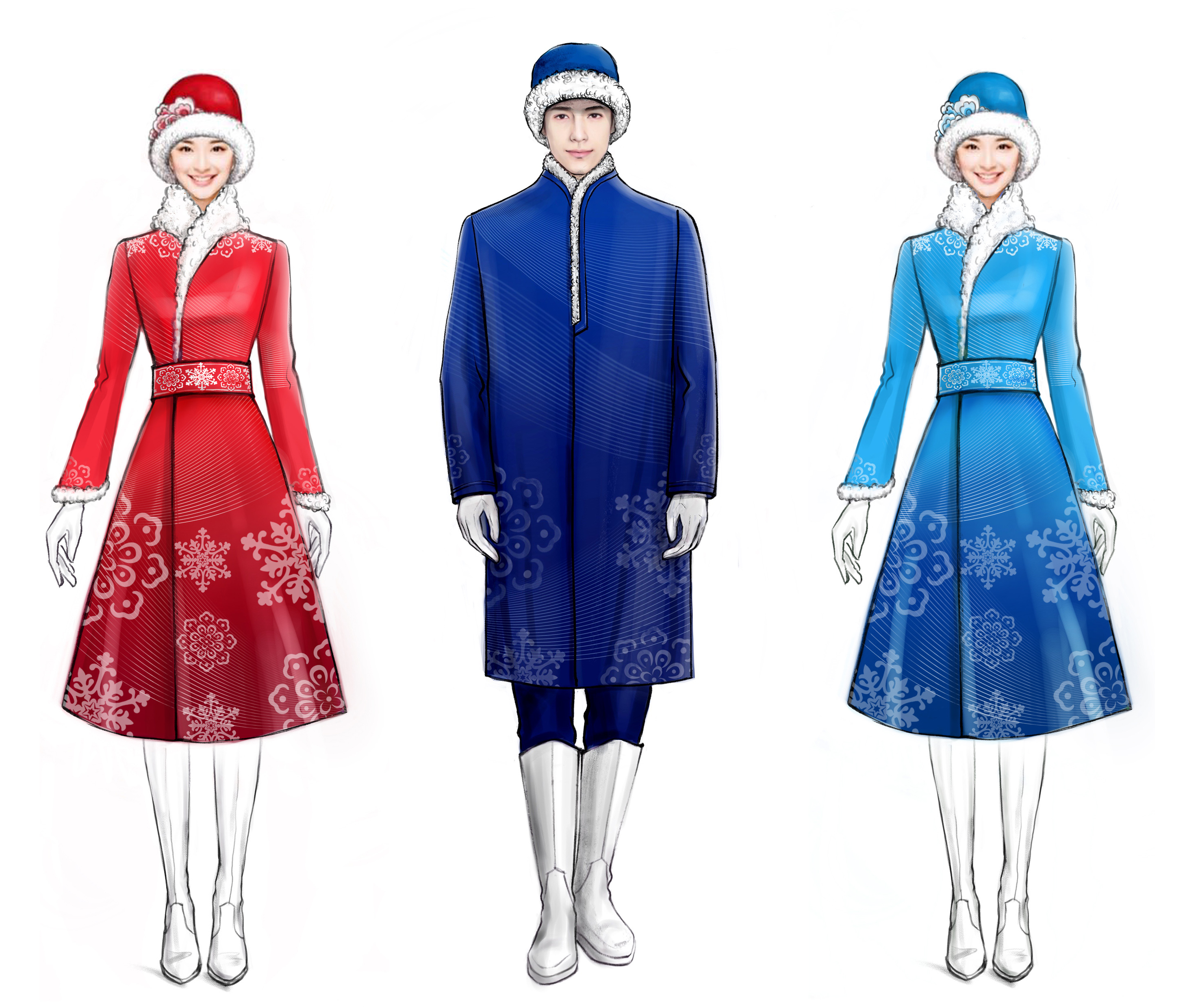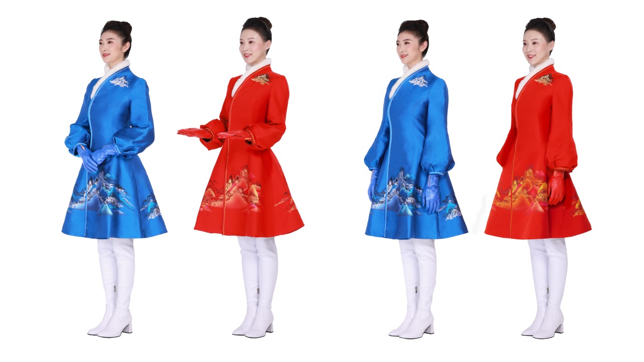 三套服裝的色彩選取自北京2022年冬奧會和冬殘奧會色彩系統中的四個主要顏色:霞光紅、天霽藍、冰藍、瑞雪白,是對中國傳統色彩文化的提煉及與冬奧精神的結合。紅色體現運動激情、春節節慶氛圍,白色與深藍、淺藍的搭配則寓意純潔冰雪、未來與夢想。