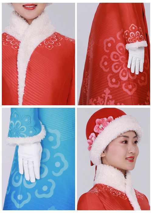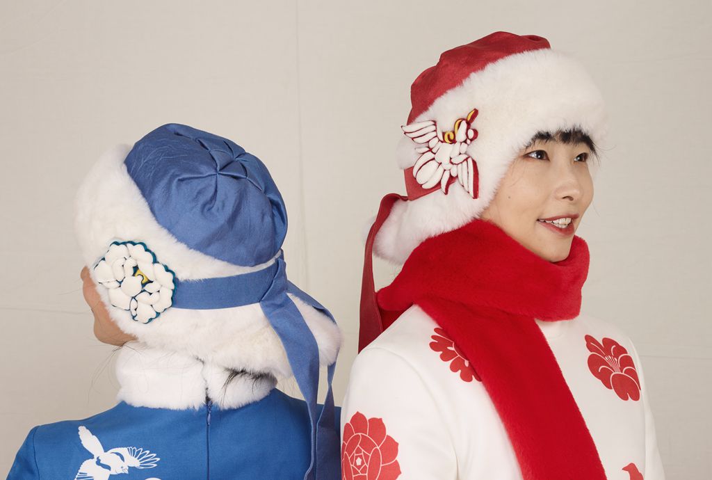“瑞雪祥云”方案中的帽子由賀陽教授設計。帽子結構為民間傳統女孩花帽式樣,最早的實物發現為遼金時期的風帽,設計和制作技法巧妙、造型獨特,充分體現了中國傳統服飾中的造物精神。帽子兩邊為傳統盤花工藝做花鳥裝飾,?造毛材質作為帽圈保護額頭及雙耳,造型俏皮活潑。帽身兩側裝飾牡丹和鳳鳥圖案盤扣,寓意吉祥喜慶、天下太平,帽尾和飄帶的設計為著裝者增添了優雅的氣息和端莊的儀式感。體現了中華民族人與自然和諧的傳統觀念,以及人文奧運、綠色奧運的精神。