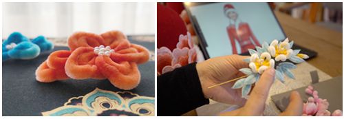 值得一提的是,女帽的設計中,毛呢氈帽的裝飾牡丹花飾,造型取自敦煌唐代牡丹花形,工藝手法采用列入北京非物質文化遺產的傳統工藝——絨花,邀請北京絨花非遺傳承人蔡志偉老師親自手工制作而成,裝飾在帽子上既呼應了服飾上的唐寶相花圖案,精致華美,也用精湛的中國傳統手工技藝向世界展示了中國工藝美學。