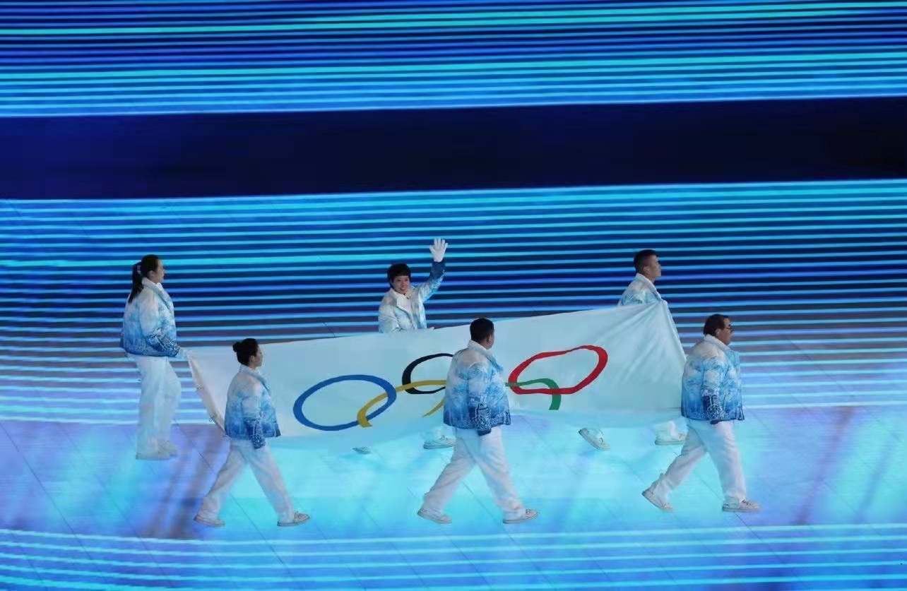 5、舉旗手服裝設計的靈感源于北京2022年冬奧會的官方視覺圖案,圖形的設計展現了中國傳統的“道法自然、天人合一”思想,融合了京張賽區山形及長城形態,以及《千里江山圖》中的青綠山水、具有中國書法韻味的冬季美景。