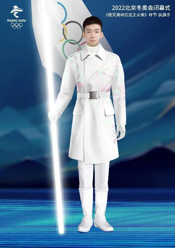 當(dāng)主火炬熄滅,每一個國家的旗桿亮起,映照出執(zhí)旗手服裝上的煥彩雪花,“在整體設(shè)計上我們希望傳遞的是中國人對于雪花即浪漫又前衛(wèi)的思考,當(dāng)執(zhí)旗手身著雪花勛章制服,守護(hù)著各國國旗在地屏上劃出炫彩的極光色國旗倒影,寓意每一個執(zhí)旗手都是雪花侍衛(wèi),守護(hù)著冬奧參與國國旗,也守護(hù)著世間每一朵雪花。”習(xí)景凱介紹說。