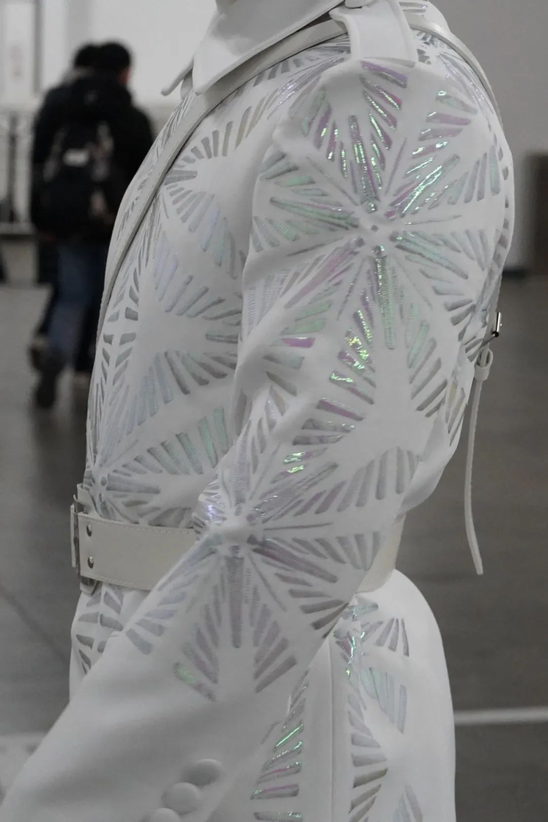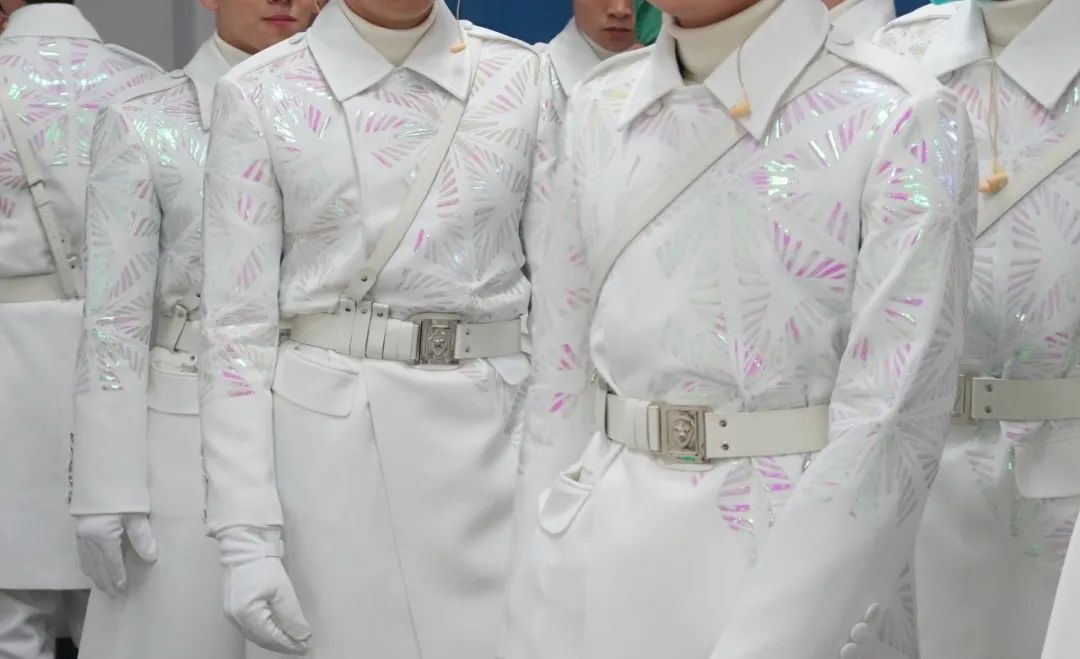 執(zhí)旗手服裝設(shè)計的靈感源于雪花,習(xí)景凱說:“我們圍繞雪花的形態(tài)我們進(jìn)行分形取象,對其基本幾何形態(tài)提取、延展、簡化、進(jìn)行現(xiàn)代化的處理,探究雪花其基本的幾何形態(tài)美。并利用這一簡單的幾何形態(tài)進(jìn)行有序的重復(fù)組合,進(jìn)行一個不對稱式的延展布局,在每一位執(zhí)旗手身上匯聚成一片片幻彩極光色的雪花勛章。配合發(fā)光旗桿,服裝上每一片雪花瓣都能折射出極光星耀般的光感。”