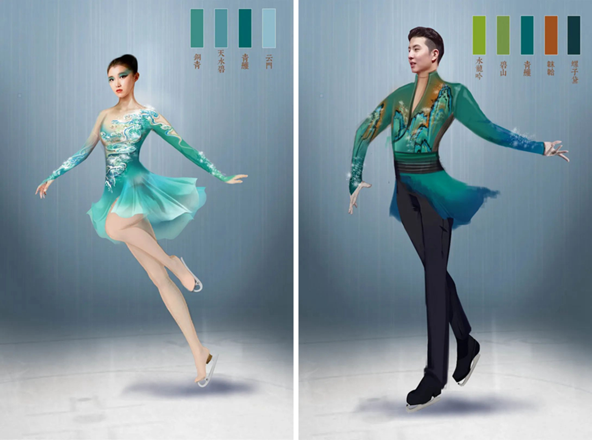 談及王詩玥、柳鑫宇《如此多嬌》節(jié)目的服裝靈感,鄭志寬說,作為東道主,就是要讓世界看到中國獨特的氣質(zhì)和文化。冰舞是藝術(shù)與技術(shù)并存的項目,最需要美的定位?!度绱硕鄫伞穼?dǎo)演編創(chuàng)的靈感也正是來自著名的詩句“江山如此多嬌”。這套服裝結(jié)合男選手高大帥氣的身材,女選手靈秀活潑的特點,借以中國古典繪畫青綠山水繪畫為素材,男伴為山,女伴為水,山水相依,各自為橋,這是一份中國特有的浪漫,是一道在冰上體現(xiàn)獨特的東方之美。兩位選手穿上這套服裝后,他們有一種“祖國大好河山任我馳騁”的感覺。