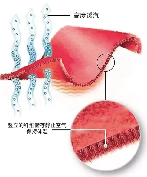 中層絨衣的主要需求是輕便保暖,這是一款用于場館內的制服。在它身上我們再一次見證了當功能遇到外觀的糾結,在權衡中必有取舍。項目后期,當服裝功能遇到服裝外觀設計方案時(早期是服裝功能與外觀兩條腿走路),如何最大限度完美實現設計的狀態下對面料工藝的要求就更高。在服裝設計方案無法改變的情況下,近乎于要求面料工藝配合設計做單向調整。為了保持絨衣已有的輕便保暖特性,我們嘗試了多種面料加工工藝。壓力與動力并存,高要求所帶來的挑戰同樣也給我們帶來了真正意義上的技術瓶頸突破。