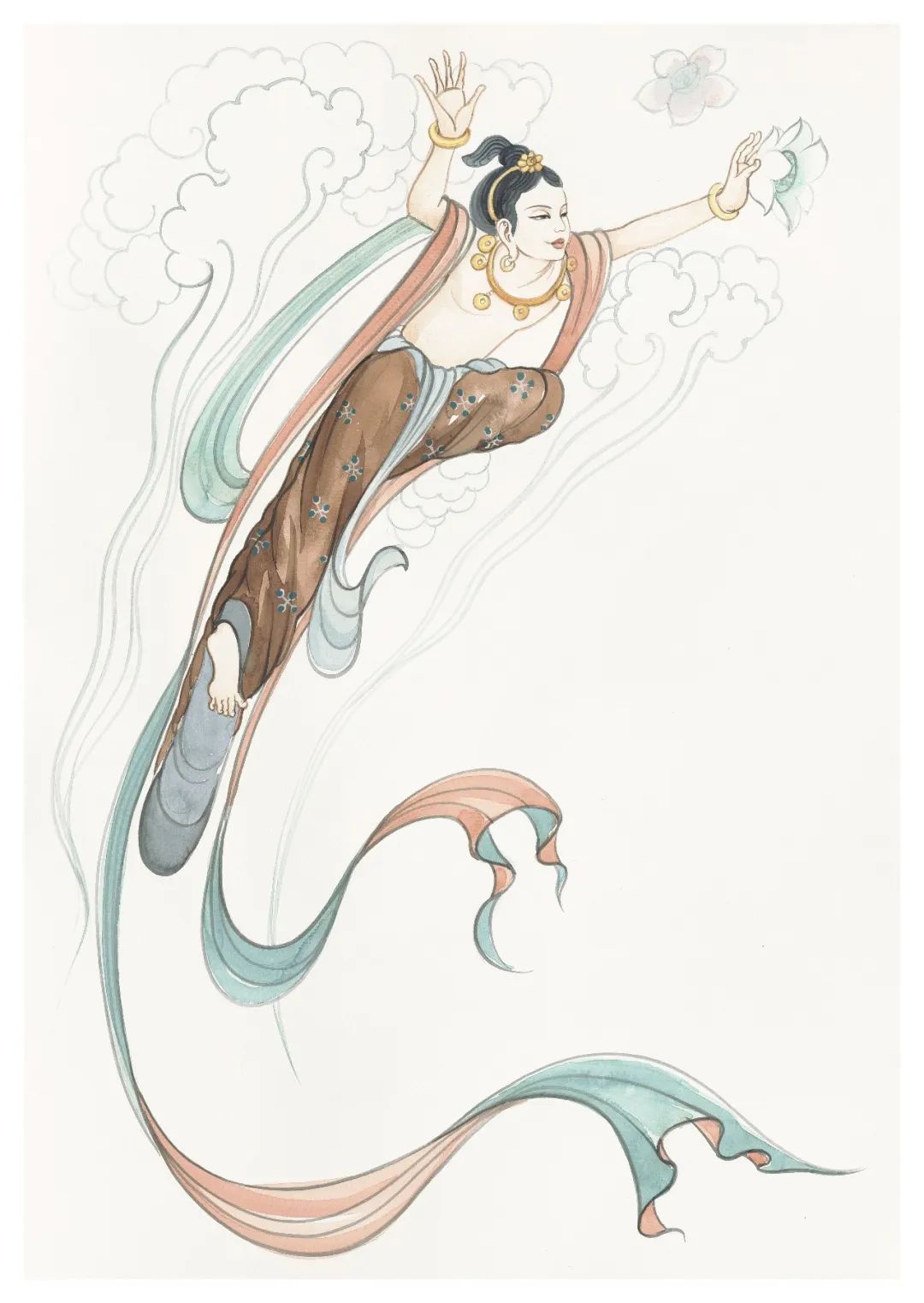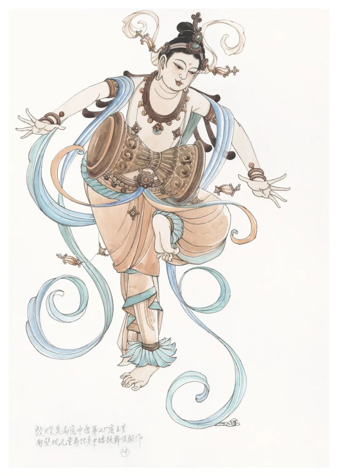 天人又稱天眾,在佛教中指的是住于欲界六天及色界諸天之有情,亦指住于天界或人界之眾生。包括天部諸神及伎樂、化生等。在佛國世界具有護佑、贊嘆、供養佛法的等職能。雖然源于虛空的天界,但是天人的形象和服飾卻是現實世界的反映和升華。