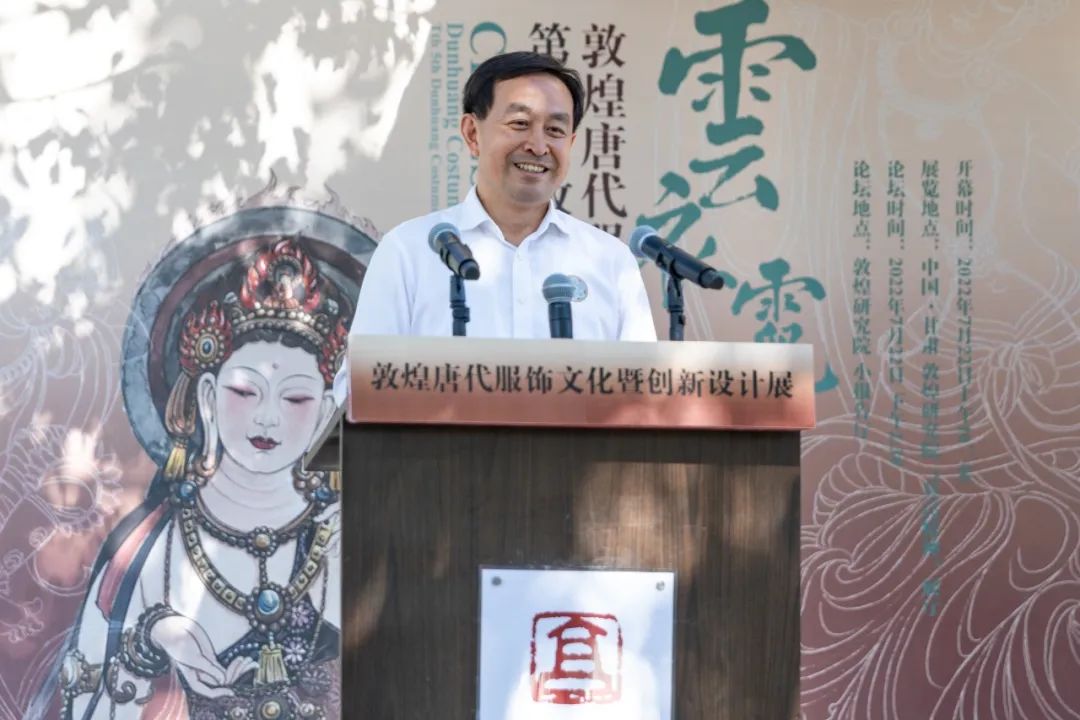 開幕式伊始,趙聲良書記致辭,他代表敦煌研究院熱烈歡迎各位領導、專家、同學的到來。他特別提到敦煌服飾文化研究是敦煌學重要的組成部分,希望展覽能夠更好地傳承和弘揚敦煌文化藝術的魅力,把敦煌服飾文化研究引向深入,同時通過創新設計為社會服務,令敦煌文化更有活力。