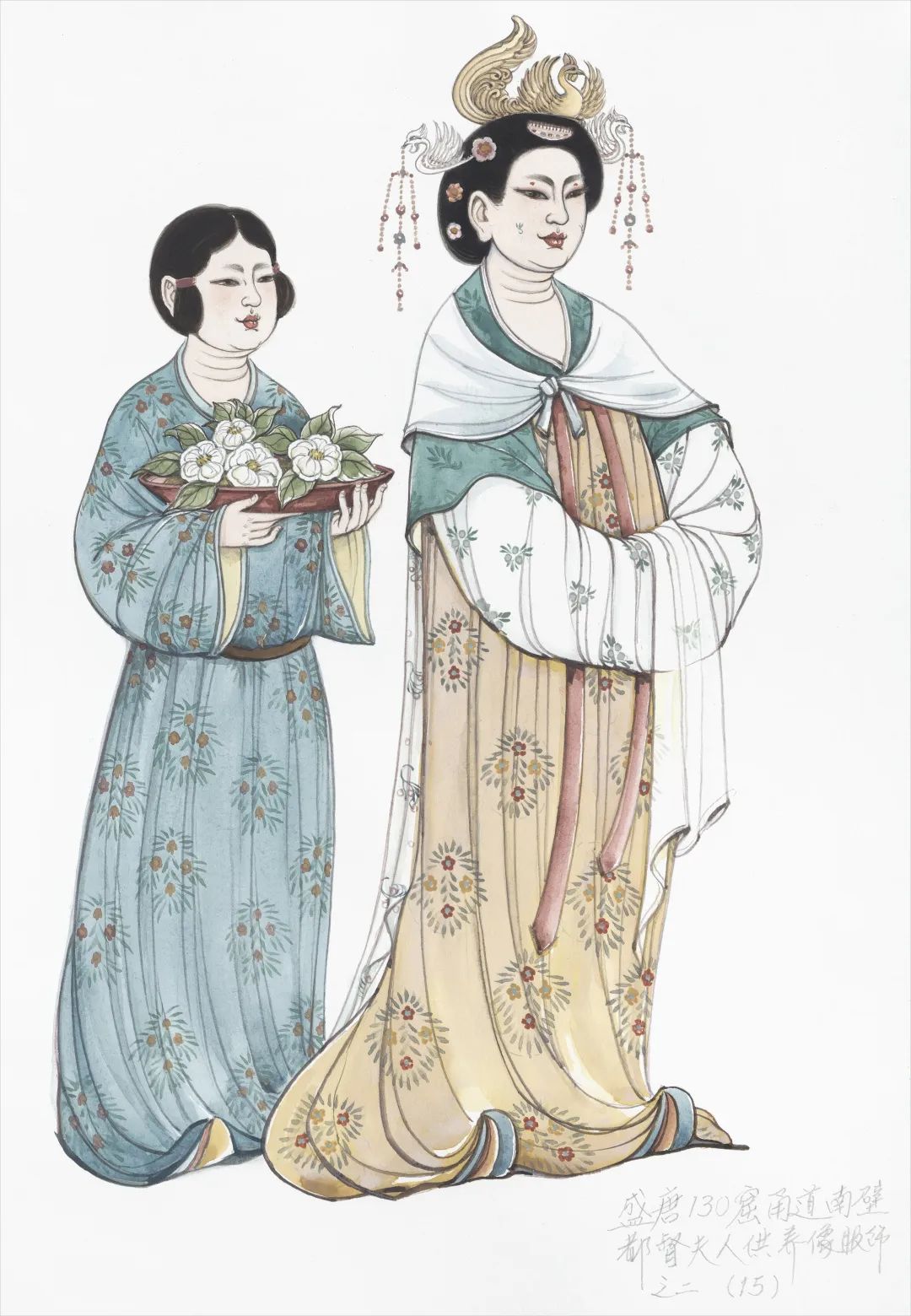 敦煌石窟壁畫和彩塑人物服飾上的裝飾圖案是敦煌藝術中不可分割的重要部分。五彩繽紛的服飾圖案來源于畫師對當時染織品的忠實描摹和適當美化,是對當時服飾圖案題材、色彩、工藝、質感的形象記載。例如唐代服飾中的團花紋樣,花瓣常常以退暈法進行表現,反映了當時人們對于圖案色相對比強烈、色階自然過渡的審美追求,同時也是當時彩色織錦流行和發達的表現。有的服飾圖案以排線的筆觸表現出了扎經染色織物的質感特點,體現了唐代發達而高超的染織工藝。