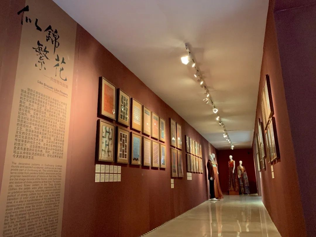 此次展覽內容豐富,包括畫稿、藝術再現服飾、創新設計服飾、視頻、學術書籍、文創品等。展覽共分為前言、菩薩服飾、天人服飾、世俗人物服飾等幾大板塊,較為全面地反映了敦煌唐代服飾文化面貌,充分展示其厚重的文化內涵和多元的裝飾手段,為藝術設計和理論研究工作者提供了生動鮮活、豐厚細致的學習研究資源。