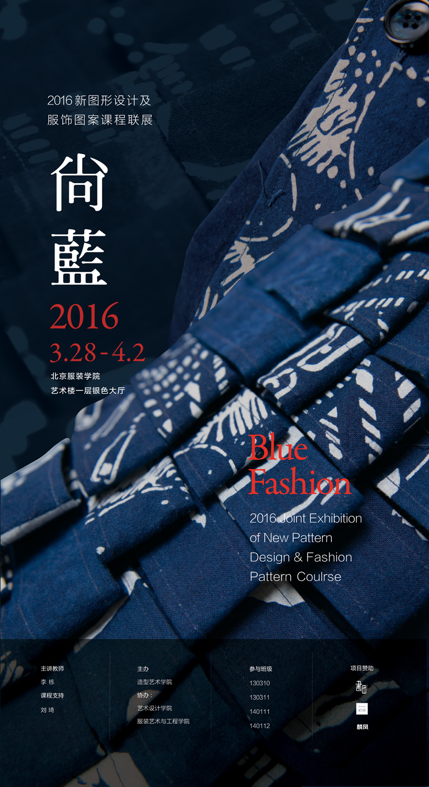 感言(畫冊最前頁)初心新圖形設計及服飾圖案課程在教學中已經第四年了,在傳統文化被各類媒體大眾頻繁提起的今天,我帶領同學們欣然開始了一場圖形設計與傳統工藝的約會。課程的核心是圖形圖案的再設計(reinvention),媒介主角則來自一千多年歷史的藍印花布。課程面對陌生而古老的藍印工藝,我與同學們要做的事情是浸入,并由此發起發起一場激發時尚審美的圖形設計實驗。初期我們深入了解了藍印花布的概況,還對近現代發生的全球藝術變革與設計風潮進行了仔細的梳理。而現代主義、波普風格、數碼幾何甚至當今網絡文化都成為了創作的來源與基礎。同學們的大膽創意把相對枯燥的過程變成了一場充分表達自我、展現藝術情懷的課堂游戲。當然,在這樣的的創作空間里自由發揮更需要的是執行力。同學們夜以繼日地親手完成制作部分,還有個別同學在長時間刻版時勞累而受傷。但是當布滿精美圖案的一張張藍布在南通古老的染坊里脫漿而出,最終展示在北服寬大展廳的時候,那同學們滿懷欣喜的歡呼,那愛不釋手的激動,我想是他們全程付出辛勞后最幸福的收獲。展覽“尚藍”取自對藍色的崇拜,更是意在喚起藍色的時尚,喚起傳統工藝與現代圖案遙相呼應的風潮。希望在年青人的眼里,傳統的手工藝不被看成束之高閣的傳說,而成為激發靈感的來源,成為引領時尚的焦點。這種具有鮮明時代特點及民族智慧的藝術如同千百年前一樣走入尋常百姓生活的時候,也許是觀看展覽后最讓人期待的。致謝(畫冊最末頁)本次展覽的順利舉辦以及籌備過程中受到各方的支持與幫助,讓我相關單位與朋友們深懷敬意。首先感謝常年支持本課程的造型藝術系、藝術設計學院、服裝藝術與工程學院的領導和專業老師們,正是他們提供了堅實的基礎保障課程與展覽的順利進行。還需要特別感謝“出于藍”項目的資助,不遠千里地讓數以百計的設計方案實施落地。優秀的展覽團隊也讓我們的作品以最隆重優雅的方式在觀眾面前亮相。最后向全程努力付出并在后期展覽提供無私幫助的所有同學們表示感謝,在老師心中你們一直是最棒的。