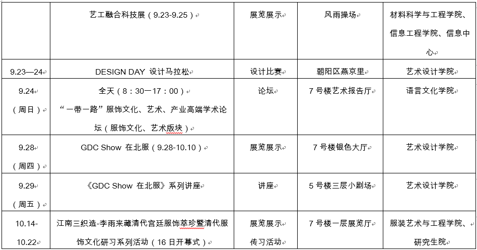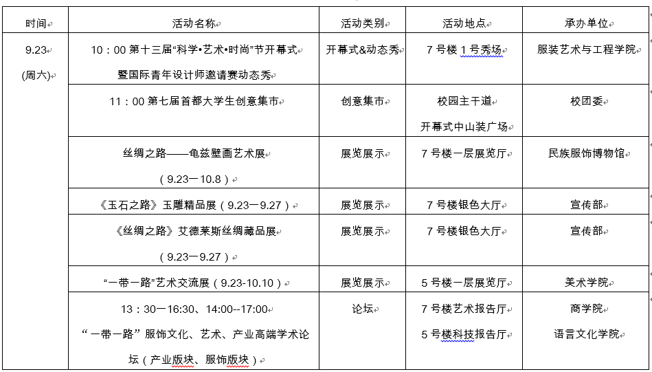北京服裝學(xué)院第十三屆“科學(xué)•藝術(shù)•時(shí)尚”節(jié)活動(dòng)一覽表(2017年9月23日—10月22日)主題: 融合•絲路