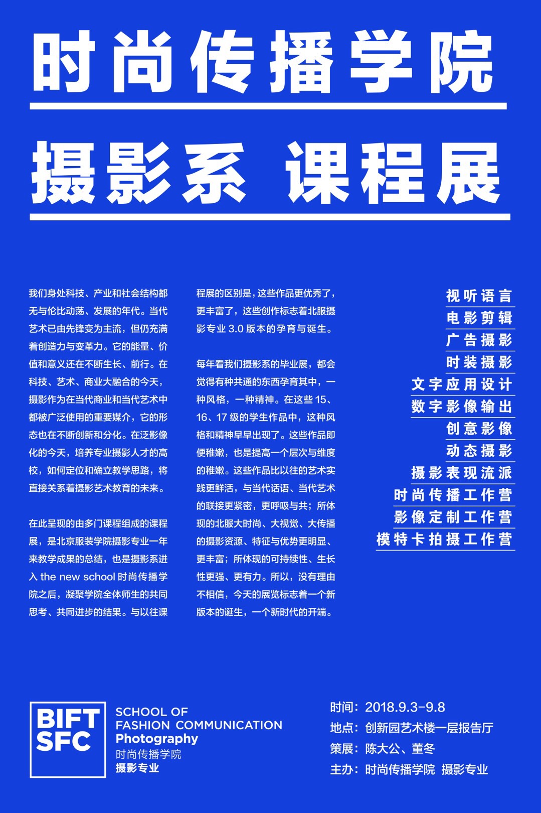在此呈現的由多門課程組成的課程展,是北京服裝學院攝影專業一年來教學成果的總結,也是攝影系進入時尚傳播學院之后,凝聚學院全體師生的共同思考、共同進步的結果。與以往課程展的區別是,這些作品更優秀了,更豐富了,這些創作標志著北服攝影專業3.0版本的孕育與誕生。