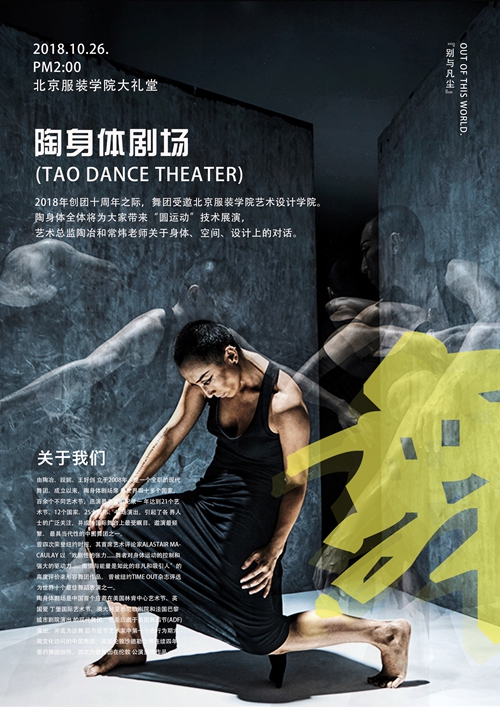 在此之前,陶身體劇場(chǎng)的藝術(shù)總監(jiān)陶冶將攜舞者,在10月26日14:00來(lái)到北京服裝學(xué)院,為同學(xué)們帶來(lái)舞團(tuán)原創(chuàng)的“圓運(yùn)動(dòng)體系”展演,并將和同學(xué)們一起暢談身體的運(yùn)動(dòng)與對(duì)美的表達(dá)。