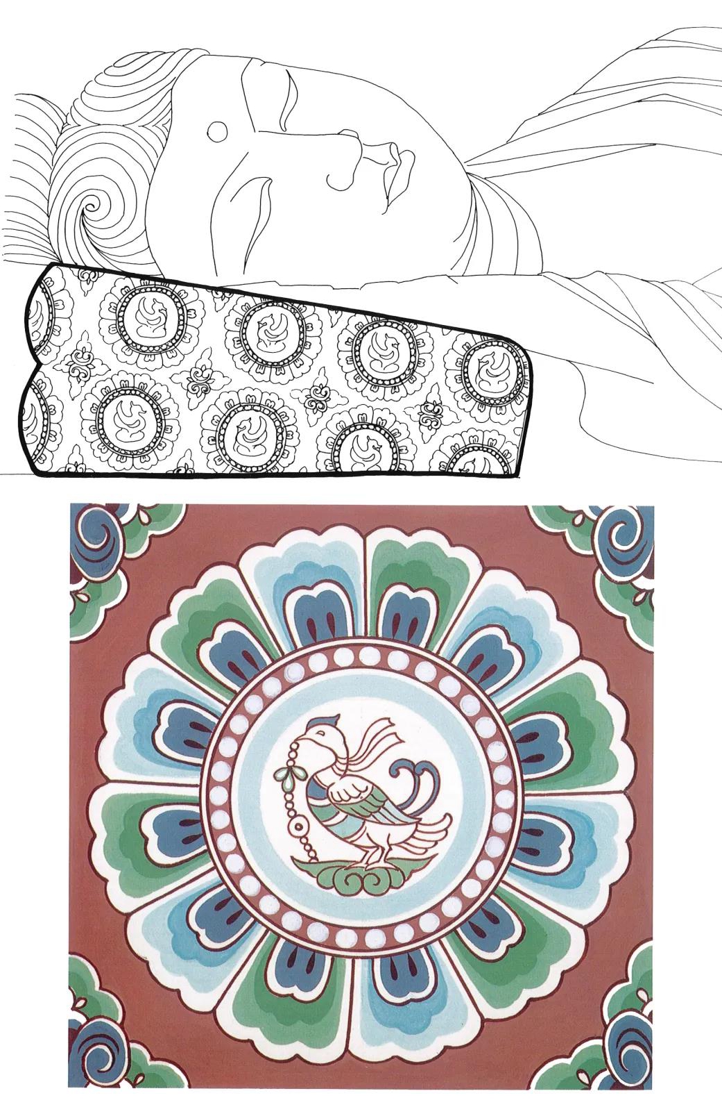 ▲設(shè)計(jì)靈感來(lái)源:敦煌莫高窟 中唐 第158窟 臥佛枕頭印花圖案(常沙娜 整理)
