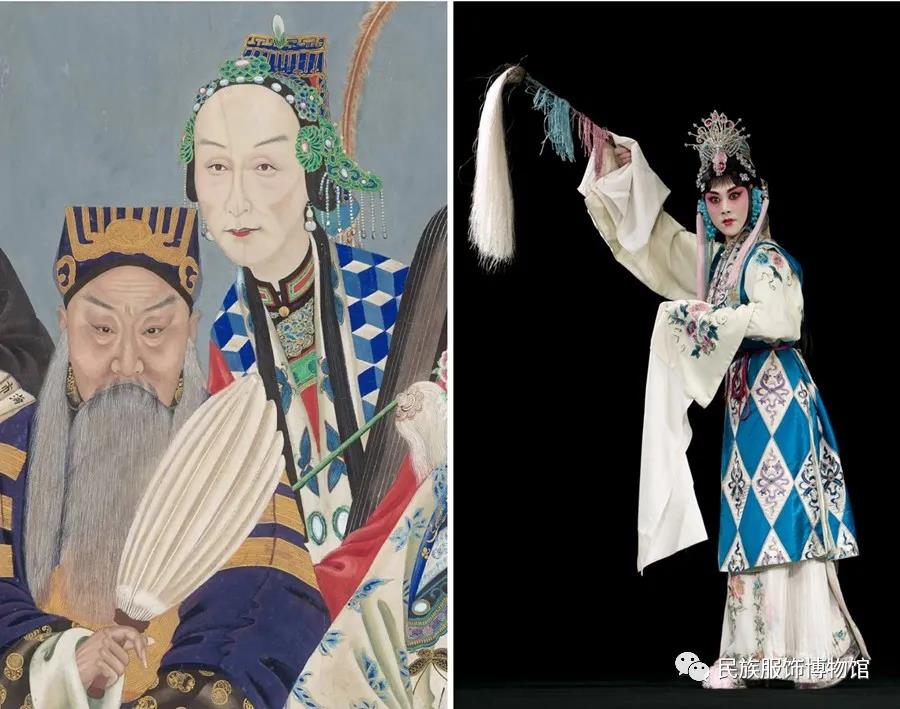 有一種觀點認為,水田衣是模仿出家人裝扮出現的流行元素,到了明清時期,隨著戲曲的不斷發展,角色演出服裝更加細化,出現了女尼角色特定穿著的幾何形狀拼布戲服,兜兜轉轉,仿佛又回歸了百衲衣的初衷。