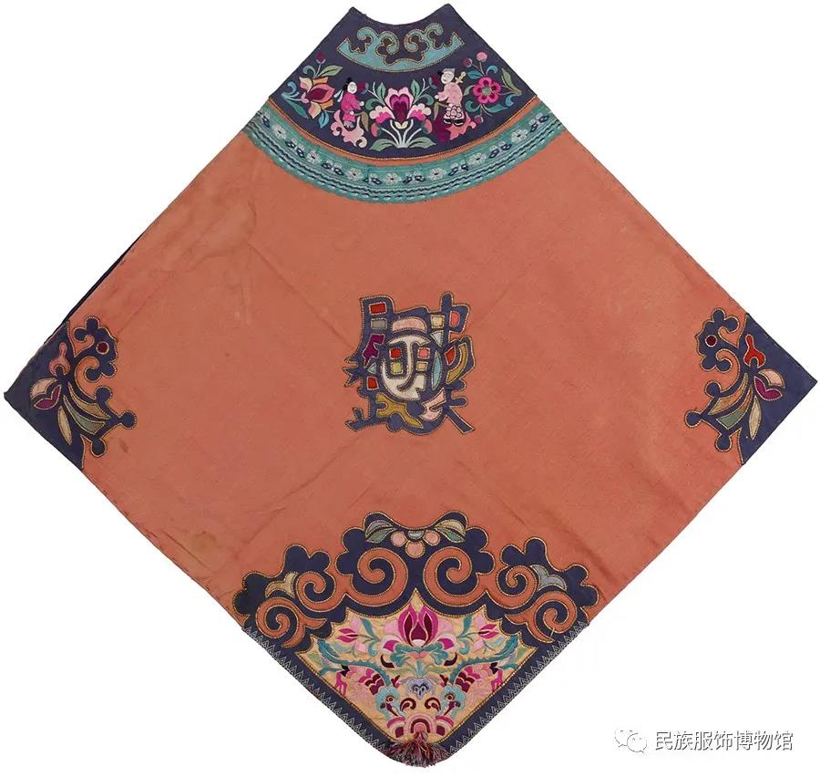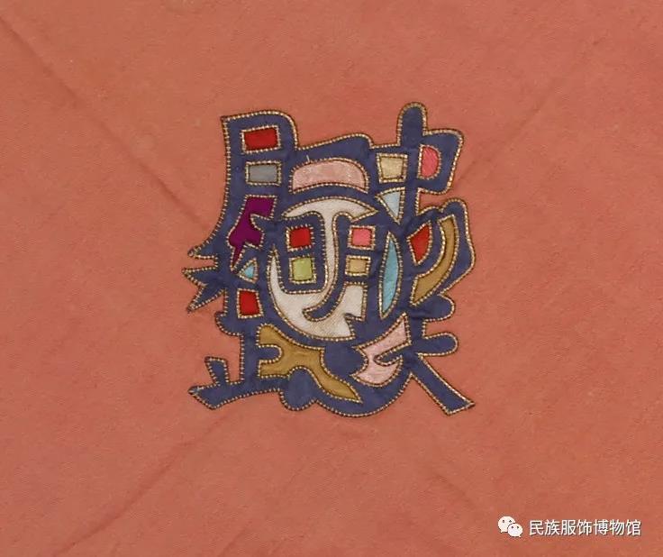民族服飾博物館收藏有一件貼布平繡肚兜,以拼布方式表現漢字合文圖形“中天月正明”。