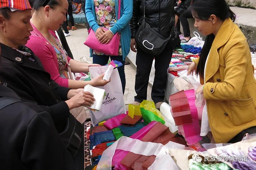 苗族婦女在蠟染百褶裙上拼縫貼花