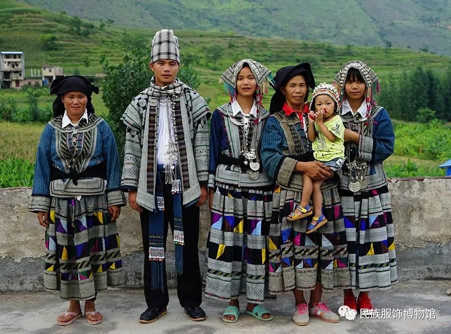 彝族全家福,女眷全部身著拼布蠟染百褶裙