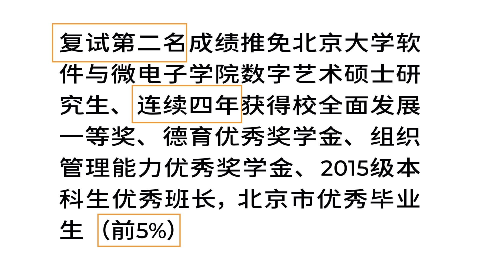用“數(shù)字量化”影響力,做簡短有意義的描述。何為“數(shù)字量化”指的是目標(biāo)或任務(wù)具體明確,可以清晰度量。如何使自己的簡歷數(shù)字化呢?具體地說,用數(shù)據(jù)或百分比指標(biāo)來量化你做過的工作與技能,如多少數(shù)量、多少次、占多少百分比等。你的表述越具體,面試官就越容易判斷出你是否適合這個(gè)崗位,以及個(gè)人是否具有清晰的邏輯能力。例如下圖中的文字所示,就做了量化處理使這段文字傳達(dá)更加清晰。
