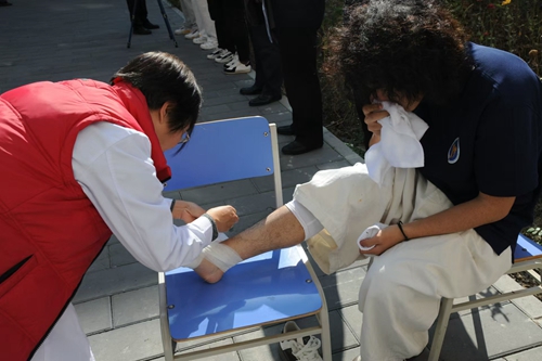 鐵路電氣化學校應急機構接訊后,按照預案接應消防車、組織現場警戒并協助開展救援;消防救援隊抵達后,迅速開展滅火和人員搜救,醫療救護組到位后立即投入傷員救治。后續,“火情”被撲滅,樓內人員全部完成疏散,“被困人員”及時得到救治,工作人員清查“受損情況”和“失火原因”,組織善后工作、恢復正常秩序,演練圓滿結束。