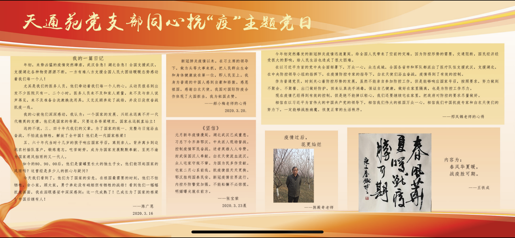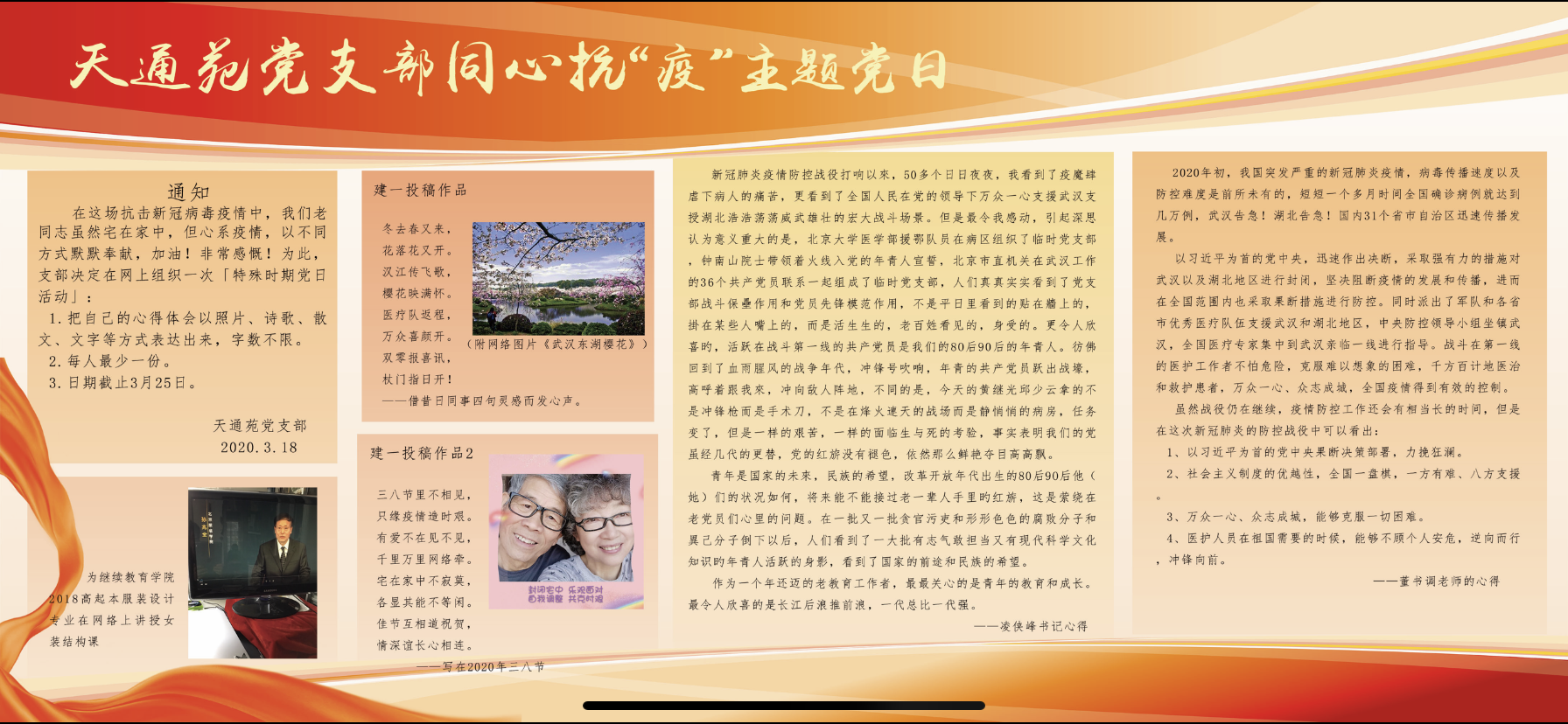 此次網上主題黨日結束后,天通苑支部將黨員們上交的作品材料制作成電子板報,在微信群中交流傳閱。主題黨日活動正值抗疫非常時期,老黨員們用特殊的方式表達了對黨和國家的熱愛、對美好生活的追求,對打贏疫情防控阻擊戰的決心和信心,以實際行動讓黨旗在疫情防控阻擊戰中高高飄揚。