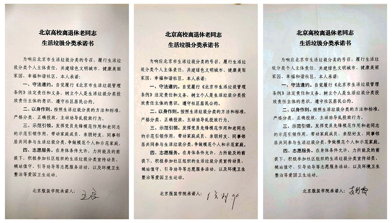 按照市委教育工委、校黨委工作要求,離退休黨委以垃圾分類為切入點,鼓勵老同志積極參與到首都社會治理工作中。5月份起,通過各類微信群、公眾號開展垃圾分類知識的學(xué)習(xí)、宣傳,動員老同志積極參與垃圾分類工作。9月份起,各支部通過屬地微信群、個人微信、走訪老同志等形式與全校650名老同志簽訂了垃圾分類承諾書。