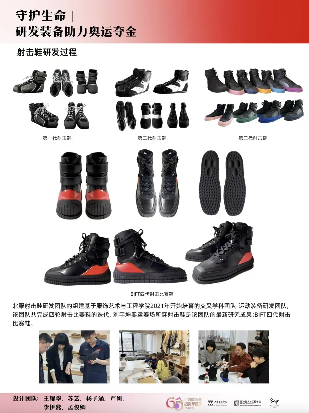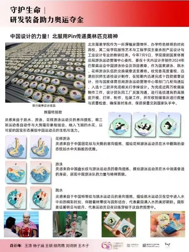 服飾藝術與工程學院射擊鞋研發團隊由黨員師生組成,團隊攻堅克難,實現國產射擊鞋“卡脖子”問題,射擊鞋除顫指標較國外品牌提升46.1%,大大提高運動員重心穩定性和舒適性,助力中國射擊隊運動員劉宇坤奪得2024年巴黎奧運會射擊男子50米步槍三姿項目比賽金牌。此外,劉宇坤在比賽中使用的槍衣也由學院研發,助力國家運動員形象提升,向世界傳遞中國的時尚設計理念和對產品的高品質追求。學院還接到國家體育總局游泳運動管理中心委托,需要在十天內設計并制作2024年巴黎奧運會中國游泳協會及項目徽章,作為國家游泳、跳水、花樣游泳隊伍的交換徽章送至賽場。由黨員師生迅速組隊的設計團隊完成十二款徽章和行李牌設計通過審核后,為完成近兩萬枚徽章制作,設計團隊連續通宵高強度推進開模、打樣等工作,最終確保準時準點、保質保量交到國家隊手中,交換徽章跟隨中國代表團將奧林匹克文化與精神傳播到世界各地。