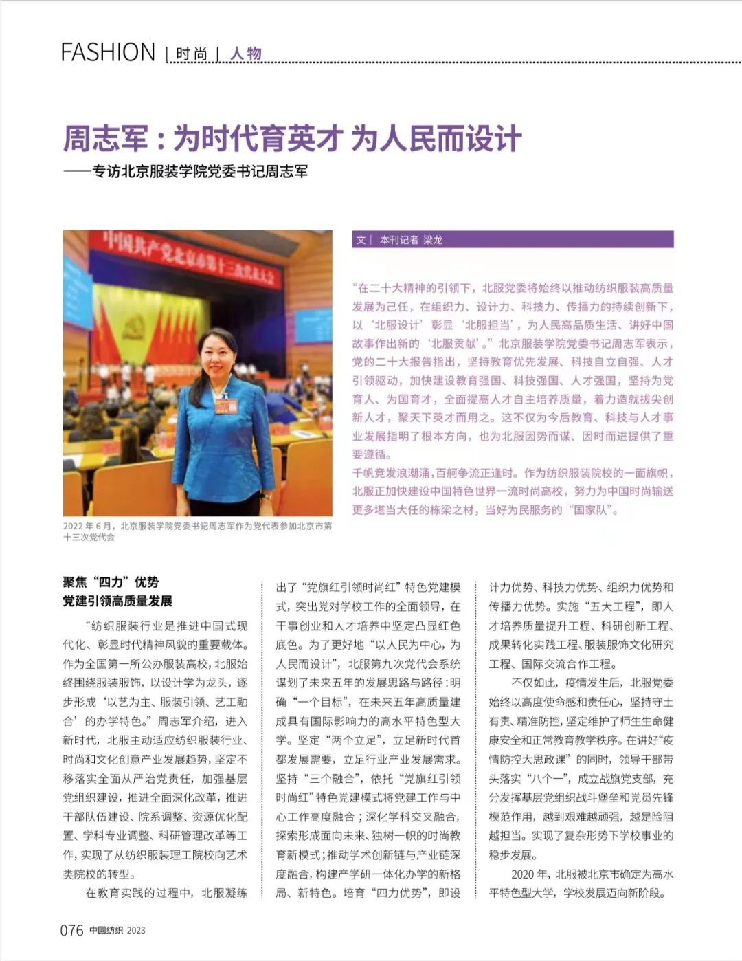 在黨的二十大精神引領下,北京服裝學院正加快建設中國特色世界一流時尚高校,當好為民服務的“國家隊”。我校黨委書記周志軍近日接受中國紡織工業(yè)聯(lián)合會會刊《中國紡織》雜志采訪,從聚焦“‘四力’優(yōu)勢,黨建引領高質量發(fā)展”“心懷國之大者 回應時代需求”“強化學科優(yōu)勢 拓寬國際視野”“以需求為導向 構建人才培養(yǎng)共同體”“探索新模式 構建時尚教育新格局”五個方面進行了深入闡述。