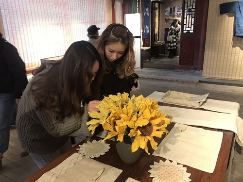 進(jìn)入展廳,學(xué)生們興致勃勃地觀看著每一件作品,有的同學(xué)在紡車前駐足觀看,拍照留念;有的被栩栩如生的“向日葵”所驚艷,在作品前認(rèn)真琢磨和探討其工藝;有的則被夏布制的衣服所折服,感嘆于它的質(zhì)樸和清雅;有的則被夏布制作的首飾而吸引,驚嘆于其工藝的精巧;有的同學(xué)則在“夏布畫”前流連忘返。此次展出的22件作品前都留下了同學(xué)們仔細(xì)觀看和探究的身影。觀展出來,同學(xué)們個(gè)個(gè)面露喜色,意猶未盡,紛紛表示收獲頗豐。